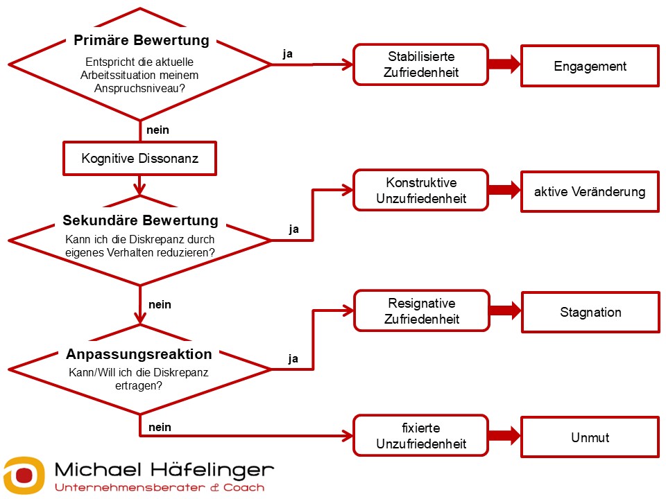 Besonders spannend ist die Analyse des Verhältnisses zwischen Arbeitssituation und Anspruchsniveau des Mitarbeiters. Danach und nach der individuellen Einschätzung, ob ggf. wahrgenommene Diskrepanzen – die kognitive Dissonanz – selbst beeinflusst werden können, werden demnach vier Stadien der Arbeitszufriedenheit unterschieden. Die entscheidenden Fragen, das daraus resultierende Stadium und die ebenfalls resultierende Arbeitseinstellung sind in folgender Grafik veranschaulicht: